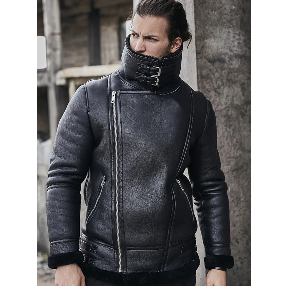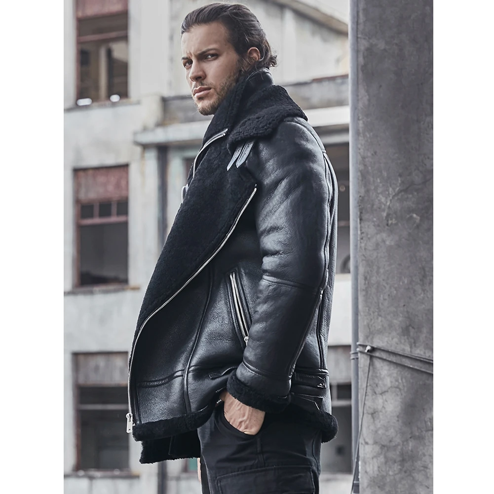 Buy 2019 New Men’s B3 Sheepskin Shearling Coat Motorcycle Men’s Leather Jacket Fur Coat Thick Winter Coats