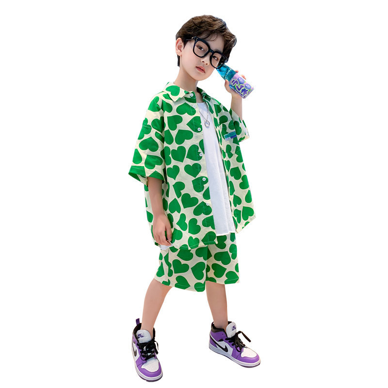 2022 Summer New Boys Turn Down Collar Shirt+Shorts Cotton Kids Heart Print Casual Suits Two Piece Children Clothes 5-14Years Old