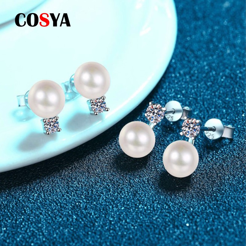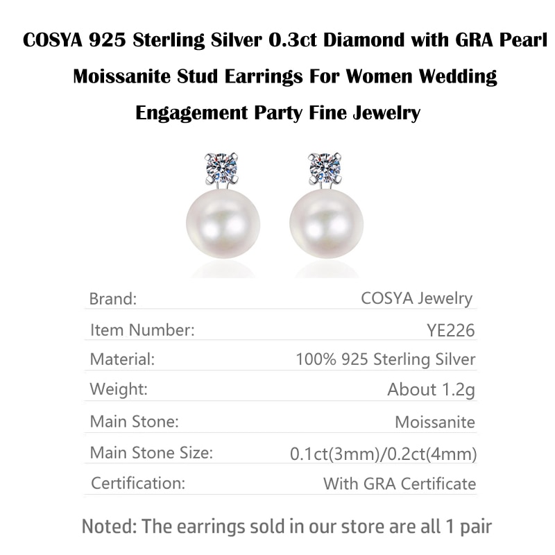 COSYA 925 Sterling Silver 0.3ct Diamond with GRA Pearl Moissanite Stud Earrings For Women Wedding Engagement Party Fine Jewelry