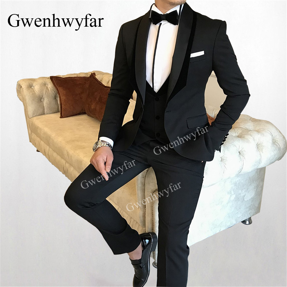 Gwenhwyfar Royal blue Men Suits Gentle Men Shawl Lapel Blazer with black edge Slim Fit Jacket Pants vest 3 Piece Groom Tuxedos