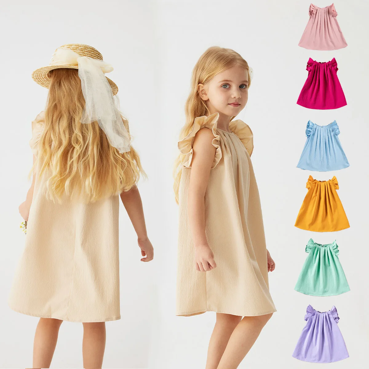 Wholesale Baby Girls Keyhole Ruffle Trim Dress Pleated Dress Casual Solid Color Kids Summer Clothes Dresses Hot Sale